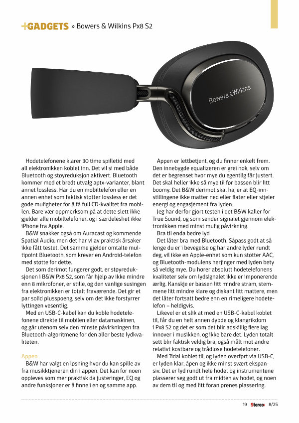Det som derimot fungerer godt, er støyreduksjonen i B & W Px8 S2, som får hjelp av ikke mindre enn 8 mikrofoner, er stille, og den vanlige susingen fra elektronikken er totalt fraværende. Det gir et par solid plusspoeng, selv om det ikke forstyrrer lyttingen vesentlig.