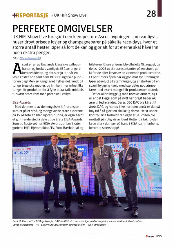 bilstereo. Disse prisene ble offisielle 15. august, og deles i 2025 ut til representanter på en større galla for de aller fleste av de vinnende produsentene. Et par timers åpen bar og god mat før utdelingen løser absolutt på stemningen, og er starten på en svært hyggelig kveld med særdeles god atmosfære med svært mange hifi-produsenter tilstede.