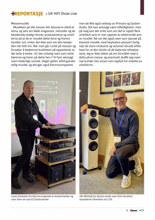 men de fikk også selskap av Primare og System Audio. Det kan selvsagt være tilfeldigheter, men på meg kan det virke som om det er opptil flere utstillere som er mer opptatt av elektronikk enn av musikk. Nå var det også noen som sjanset på klassisk musikk, med høyttalere plassert farlig nær de store vinduene og volumet skrudd altfor høyt for at den skulle nå de bakerste sitteplassene. Jeg er ikke sikker på om formålet med å delta på en messe, og eventuelt skaffe seg noen nye kunder kan anses som oppfylt for enkelte av utstillerne.