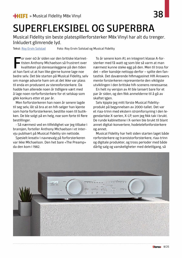 Selv kjøpte jeg mitt første Musical Fidelityprodukt på begynnelsen av 2000-tallet. Det var et riaa-trinn med ekstern strømforsyning i den legendariske X-serien, X-LP, som jeg fikk tak i brukt. De runde kabinettene i X-serien ble brukt til blant annet digital-konvertere, hodetelefonforsterkere og annet.
