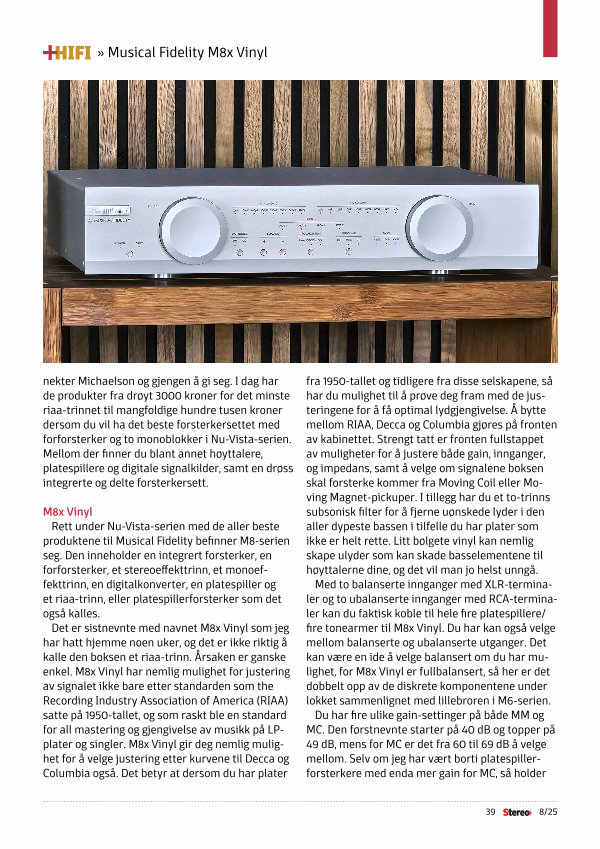 M8x Vinyl Rett under Nu-Vista-serien med de aller beste produktene til Musical Fidelity befinner M8-serien seg. Den inneholder en integrert forsterker, en forforsterker, et stereoeffekttrinn, et monoeffekttrinn, en digitalkonverter, en platespiller og et riaa-trinn, eller platespillerforsterker som det også kalles.