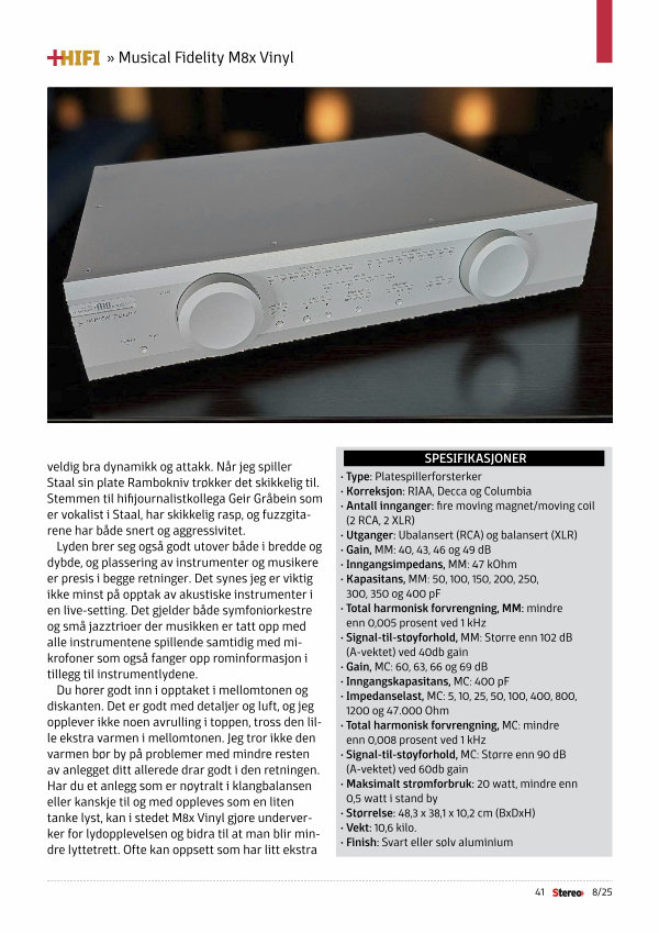 Du hører godt inn i opptaket i mellomtonen og diskanten. Det er godt med detaljer og luft, og jeg opplever ikke noen avrulling i toppen, tross den lille ekstra varmen i mellomtonen. Jeg tror ikke den varmen bør by på problemer med mindre resten av anlegget ditt allerede drar godt i den retningen. Har du et anlegg som er nøytralt i klangbalansen eller kanskje til og med oppleves som en liten tanke lyst, kan i stedet M8x Vinyl gjøre underverker for lydopplevelsen og bidra til at man blir mindre lyttetrett. Ofte kan oppsett som har litt ekstra