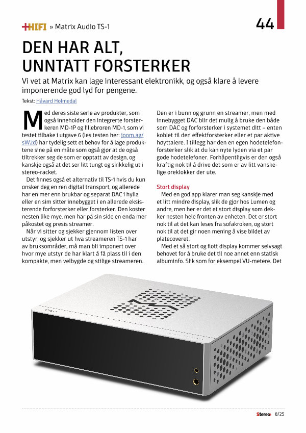 Det finnes også et alternativ til TS-1 hvis du kun ønsker deg en ren digital transport, og allerede har en mer enn brukbar og separat DAC i hylla eller en sim sitter innebygget i en allerede eksisterende forforsterker eller forsterker. Den koster nesten like mye, men har på sin side en enda mer påkostet og presis streamer.