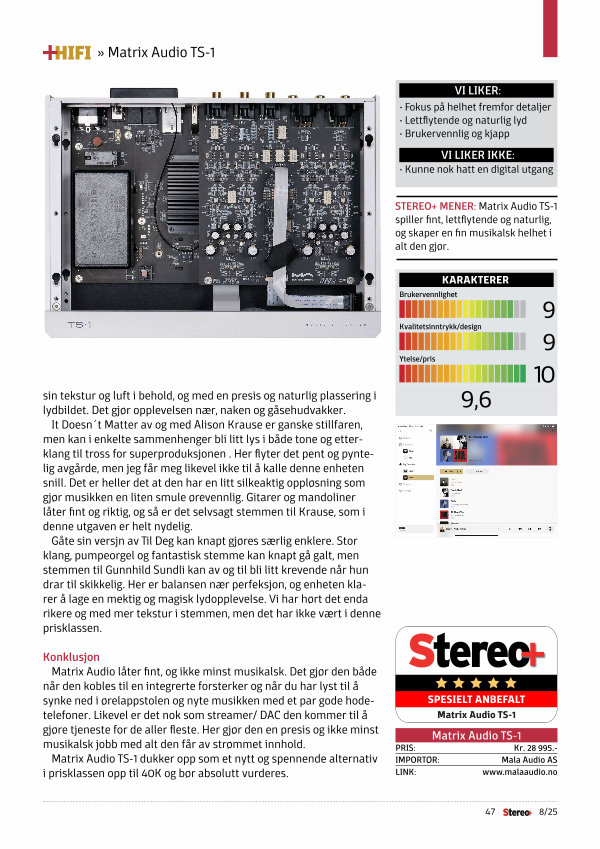 STEREO + MENER: Matrix Audio TS-1 spiller fint, lettflytende og naturlig, og skaper en fin musikalsk helhet i alt den gjør.