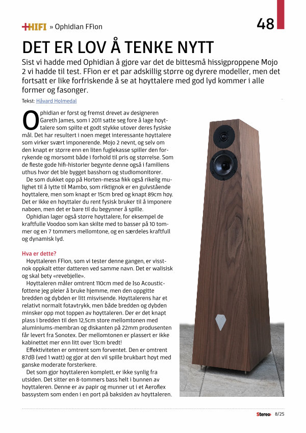 Sist vi hadde med Ophidian å gjøre var det de bittesmå hissigproppene Mojo 2 vi hadde til test. FFion er et par adskillig større og dyrere modeller, men det fortsatt er like forfriskende å se at høyttalere med god lyd kommer i alle former og fasonger.