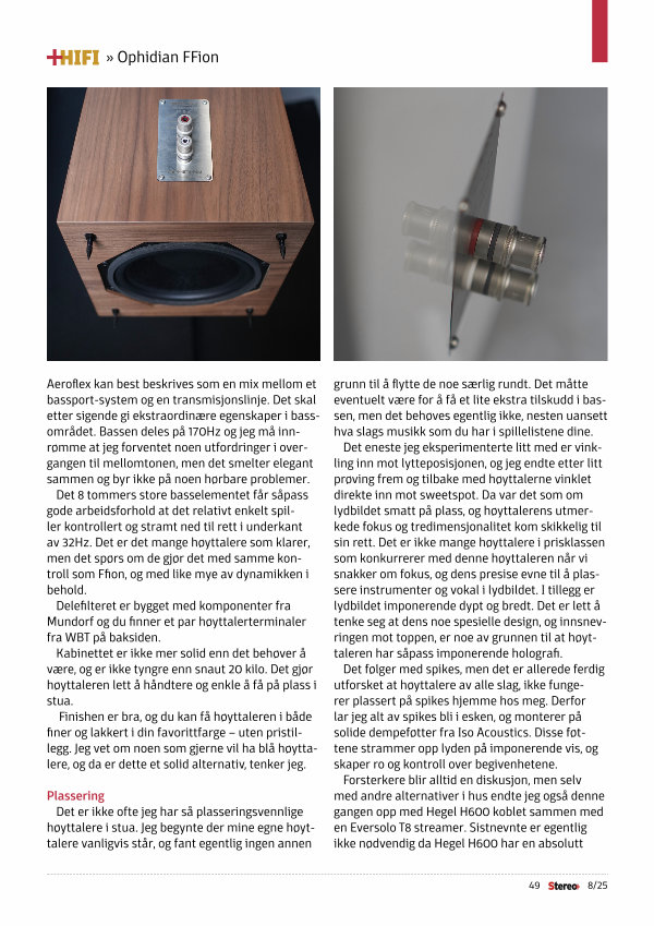 Det 8 tommers store basselementet får såpass gode arbeidsforhold at det relativt enkelt spiller kontrollert og stramt ned til rett i underkant av 32Hz. Det er det mange høyttalere som klarer, men det spørs om de gjør det med samme kontroll som Ffion, og med like mye av dynamikken i behold.