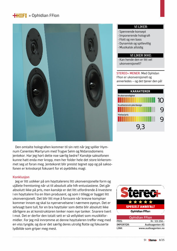 Jeg er litt usikker på om høyttalerens litt ukonvensjonelle form og ujålete fremtoning når ut til absolutt alle hifi-entusiastene. Det går absolutt ikke på pris, men kanskje er det litt utfordrende å investere i en høyttalere fra en liten produsent, og som i tillegg er bygget litt ukonvensjonelt. Det blir litt mye å forsvare når kresne kompiser kommer innom og skal ta nyervervelsene i nærmere øyesyn. Det er selvsagt bare tull, for en bra høyttaler som dette blir absolutt ikke dårligere av at konstruktøren tenker noen nye tanker. Snarere tvert i mot. Det er derfor den totalt sett er så vellykket som musikkformidler. For jeg må innrømme at denne høyttaleren treffer meg med en viss tyngde, og da er det særlig deres utrolig flotte og fokuserte lydbilde som griper meg mest.