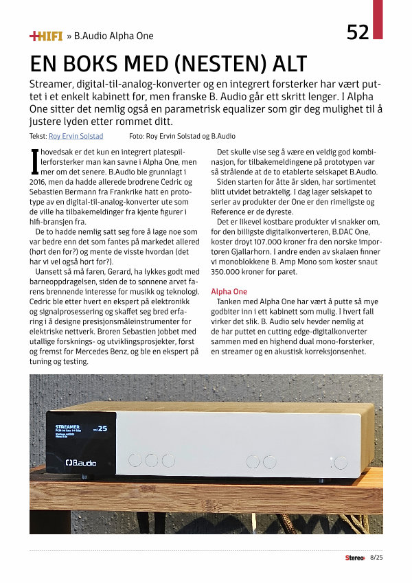 Streamer, digital-til-analog-konverter og en integrert forsterker har vært puttet i et enkelt kabinett før, men franske B. Audio går ett skritt lenger. I Alpha One sitter det nemlig også en parametrisk equalizer som gir deg mulighet til å justere lyden etter rommet ditt.
