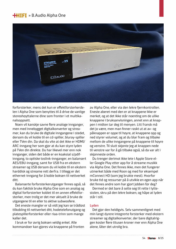 Lyden Det gjør den heldigvis. Selv sammenlignet med min langt dyrere integrerte forsterker med ekstern streamer og digitalkonverter, der bare digitalriggen koster flere titusen kroner mer enn Alpha One alene, låter det utrolig bra.