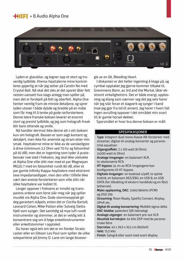 Nå handler derimot ikke denne alt-i-ett-boksen kun om holografi. Bassen er som sagt kontant og detaljert, men ikke for anemisk og stram etter min smak. Høyttalerne mine er ikke av de vanskeligste å drive( minimum 3,2 Ohm ved 70 hz og følsomhet på 92 dB), men det er ingenting som tyder å pustebesvær noe sted i frekvens. Jeg skal ikke utelukke at Alpha One ville slitt mer med et par Magnepan MG20.7 med en følsomhet rundt 80 dB, eller et par gamle Infinity Kappa-høyttalere med ekstremt lave impedansedipper, men den ville i tilfelle ikke vært den eneste forsterkeren som ville slitt når slike høyttalere var koblet til.