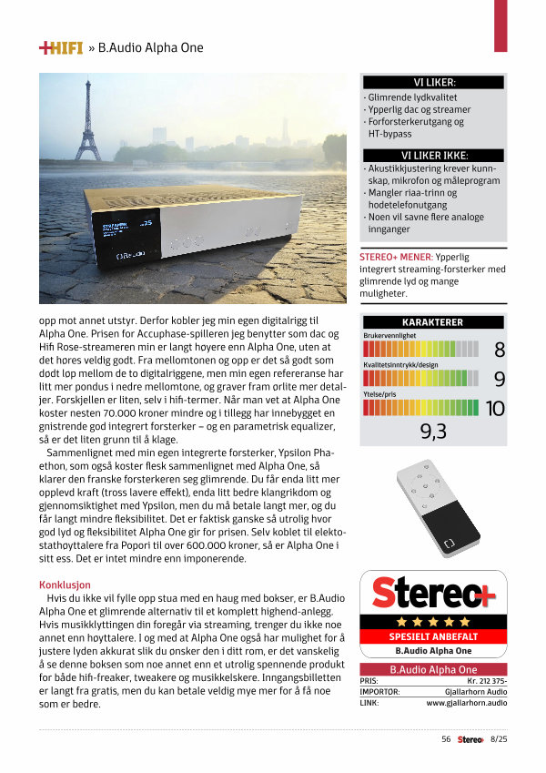 Hvis du ikke vil fylle opp stua med en haug med bokser, er B. Audio Alpha One et glimrende alternativ til et komplett highend-anlegg. Hvis musikklyttingen din foregår via streaming, trenger du ikke noe annet enn høyttalere. I og med at Alpha One også har mulighet for å justere lyden akkurat slik du ønsker den i ditt rom, er det vanskelig å se denne boksen som noe annet enn et utrolig spennende produkt for både hifi-freaker, tweakere og musikkelskere. Inngangsbilletten er langt fra gratis, men du kan betale veldig mye mer for å få noe som er bedre.
