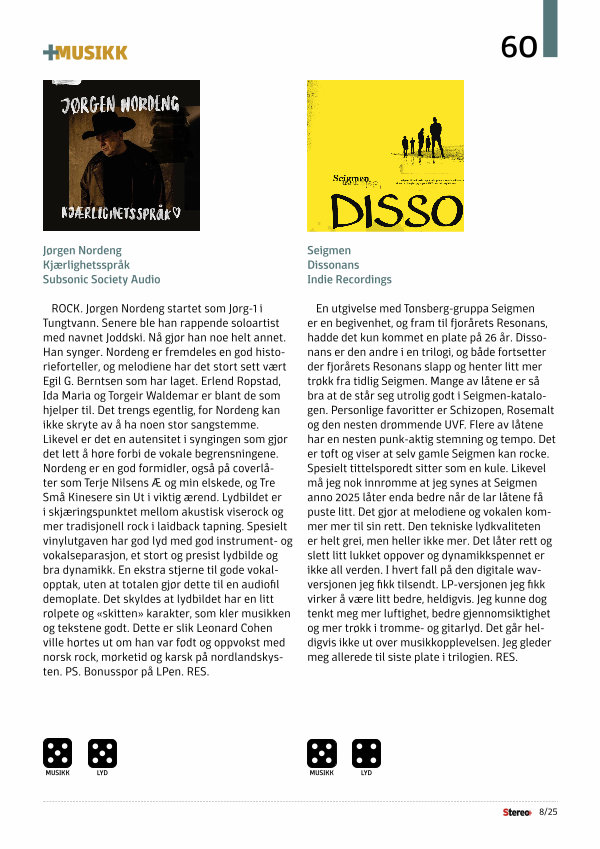 En utgivelse med Tønsberg-gruppa Seigmen er en begivenhet, og fram til fjorårets Resonans, hadde det kun kommet en plate på 26 år. Dissonans er den andre i en trilogi, og både fortsetter der fjorårets Resonans slapp og henter litt mer trøkk fra tidlig Seigmen. Mange av låtene er så bra at de står seg utrolig godt i Seigmen-katalogen. Personlige favoritter er Schizopen, Rosemalt og den nesten drømmende UVF. Flere av låtene har en nesten punk-aktig stemning og tempo. Det er tøft og viser at selv gamle Seigmen kan rocke. Spesielt tittelsporedt sitter som en kule. Likevel må jeg nok innrømme at jeg synes at Seigmen anno 2025 låter enda bedre når de lar låtene få puste litt. Det gjør at melodiene og vokalen kommer mer til sin rett. Den tekniske lydkvaliteten er helt grei, men heller ikke mer. Det låter rett og slett litt lukket oppover og dynamikkspennet er ikke all verden. I hvert fall på den digitale wavversjonen jeg fikk tilsendt. LP-versjonen jeg fikk virker å være litt bedre, heldigvis. Jeg kunne dog tenkt meg mer luftighet, bedre gjennomsiktighet og mer trøkk i tromme- og gitarlyd. Det går heldigvis ikke ut over musikkopplevelsen. Jeg gleder meg allerede til siste plate i trilogien. RES.