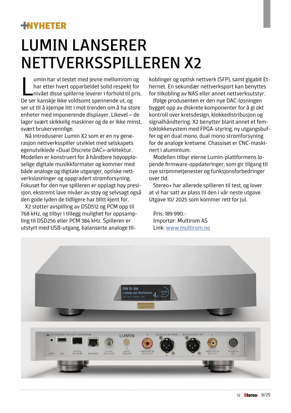 Stereo + har allerede spilleren til test, og lover at vi har satt av plass til den i vår neste utgave. Utgave 10 / 2025 som kommer rett før jul.