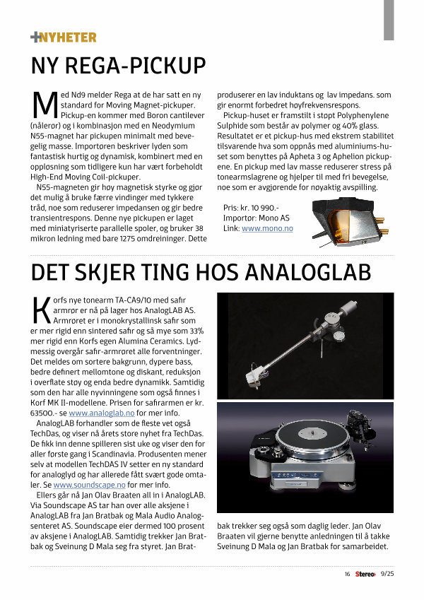 AnalogLAB forhandler som de fleste vet også TechDas, og viser nå årets store nyhet fra TechDas. De fikk inn denne spilleren sist uke og viser den for aller første gang i Scandinavia. Produsenten mener selv at modellen TechDAS IV setter en ny standard for analoglyd og har allerede fått svært gode omtaler. Se www. soundscape. no for mer info.