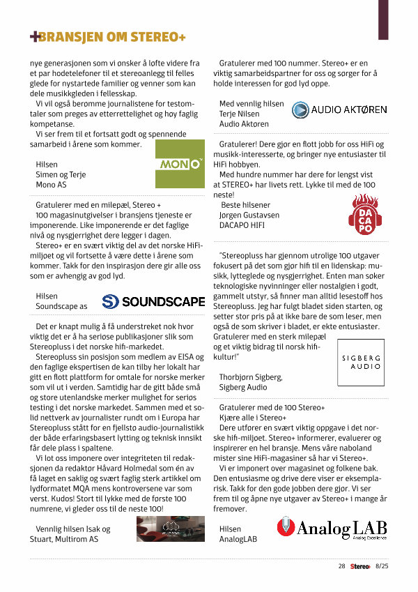 Gratulerer med de 100 Stereo + Kjære alle i Stereo + Dere utfører en svært viktig oppgave i det norske hifi-miljøet. Stereo + informerer, evaluerer og inspirerer en hel bransje. Mens våre naboland mister sine HiFi-magasiner så har vi Stereo +.