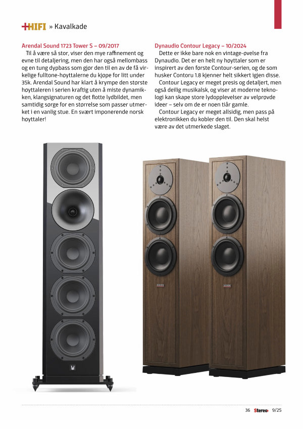 Arendal Sound 1723 Tower S – 09 / 2017 Til å være så stor, viser den mye raffinement og evne til detaljering, men den har også mellombass og en tung dypbass som gjør den til en av de få virkelige fulltone-høyttalerne du kjøpe for litt under 35k. Arendal Sound har klart å krympe den største høyttaleren i serien kraftig uten å miste dynamikken, klangsignaturen og det flotte lydbildet, men samtidig sørge for en størrelse som passer utmerket i en vanlig stue. En svært imponerende norsk høyttaler!