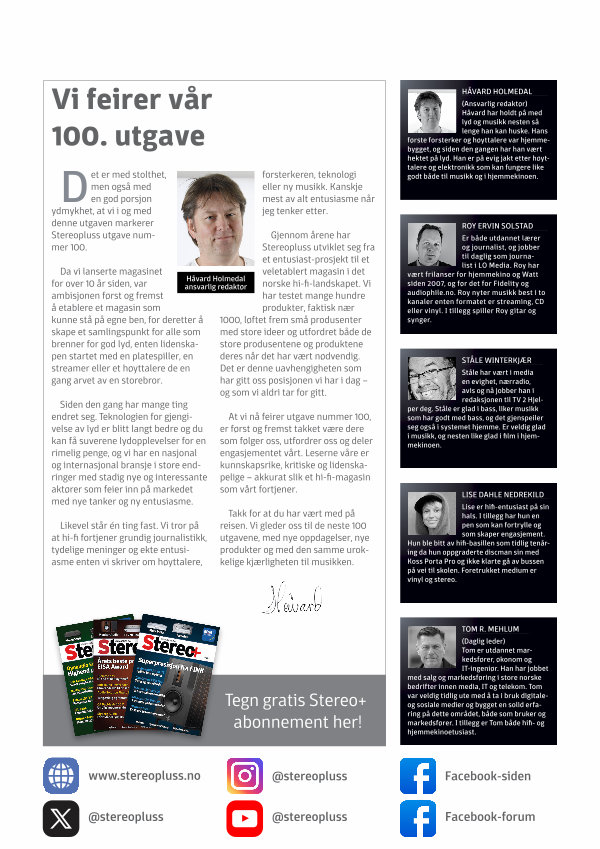 At vi nå feirer utgave nummer 100, er først og fremst takket være dere som følger oss, utfordrer oss og deler engasjementet vårt. Leserne våre er kunnskapsrike, kritiske og lidenskapelige – akkurat slik et hi-fi-magasin som vårt fortjener.