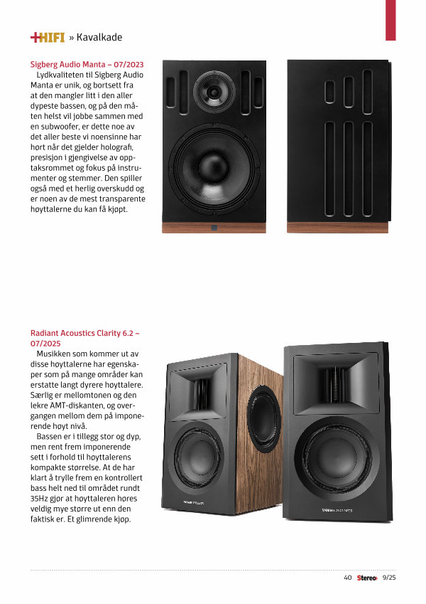 Lydkvaliteten til Sigberg Audio Manta er unik, og bortsett fra at den mangler litt i den aller dypeste bassen, og på den måten helst vil jobbe sammen med en subwoofer, er dette noe av det aller beste vi noensinne har hørt når det gjelder holografi, presisjon i gjengivelse av opptaksrommet og fokus på instrumenter og stemmer. Den spiller også med et herlig overskudd og er noen av de mest transparente høyttalerne du kan få kjøpt.