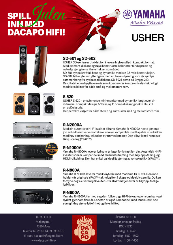DACAPO HIFI Møllergata 1 1530 Moss Telefon: 69 25 60 44 / 90 98 66 81 E-post: dacapohifi @ gmail. com www. dacapohifi. no