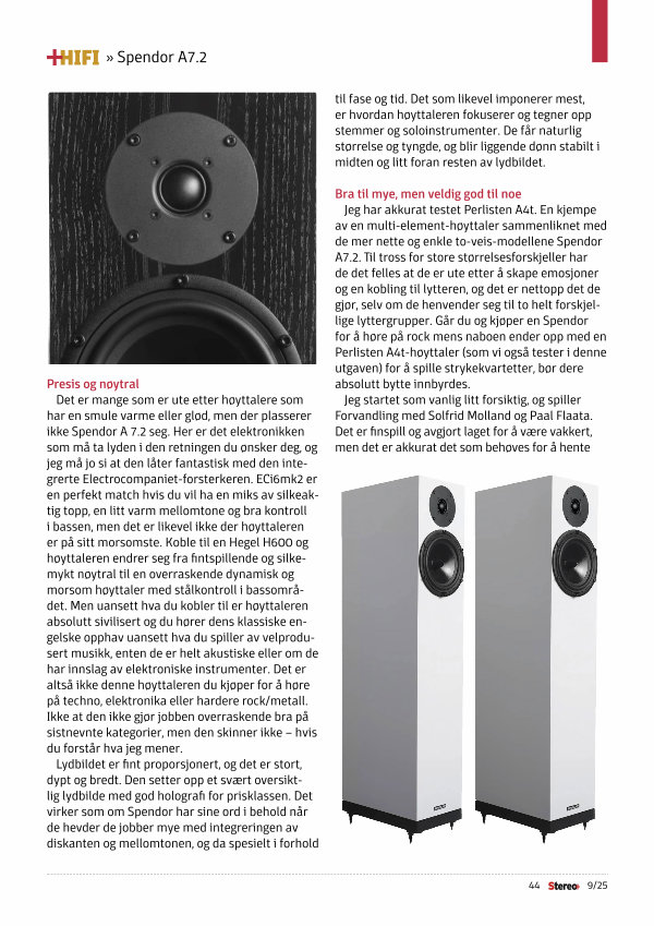 » Spendor A7.2 til fase og tid. Det som likevel imponerer mest, er hvordan høyttaleren fokuserer og tegner opp stemmer og soloinstrumenter. De får naturlig størrelse og tyngde, og blir liggende dønn stabilt i midten og litt foran resten av lydbildet.