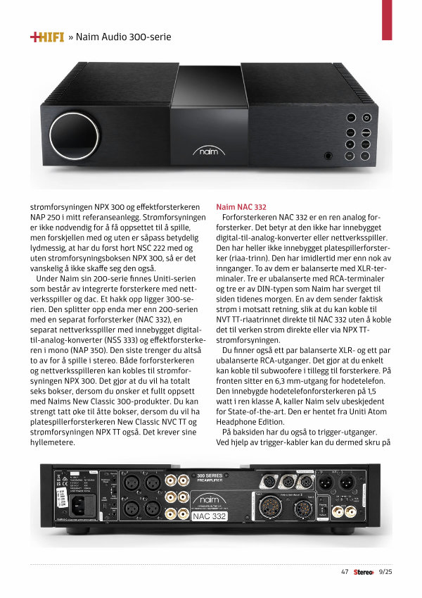 Under Naim sin 200-serie finnes Uniti-serien som består av integrerte forsterkere med nettverksspiller og dac. Et hakk opp ligger 300-serien. Den splitter opp enda mer enn 200-serien med en separat forforsterker( NAC 332), en separat nettverksspiller med innebygget digitaltil-analog-konverter( NSS 333) og effektforsterkeren i mono( NAP 350). Den siste trenger du altså to av for å spille i stereo. Både forforsterkeren og nettverksspilleren kan kobles til strømforsyningen NPX 300. Det gjør at du vil ha totalt seks bokser, dersom du ønsker et fullt oppsett med Naims New Classic 300-produkter. Du kan strengt tatt øke til åtte bokser, dersom du vil ha platespillerforsterkeren New Classic NVC TT og strømforsyningen NPX TT også. Det krever sine hyllemetere.