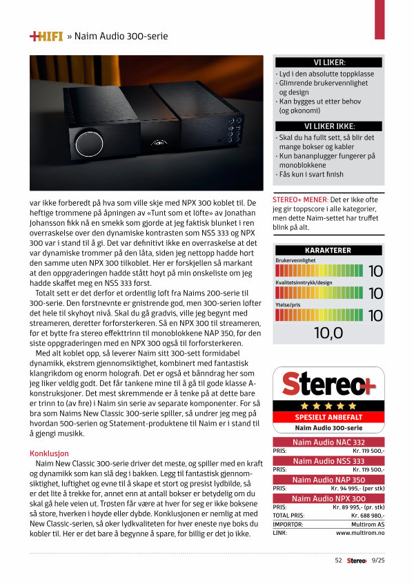 Totalt sett er det derfor et ordentlig løft fra Naims 200-serie til 300-serie. Den førstnevnte er gnistrende god, men 300-serien løfter det hele til skyhøyt nivå. Skal du gå gradvis, ville jeg begynt med streameren, deretter forforsterkeren. Så en NPX 300 til streameren, før et bytte fra stereo effekttrinn til monoblokkene NAP 350, før den siste oppgraderingen med en NPX 300 også til forforsterkeren.