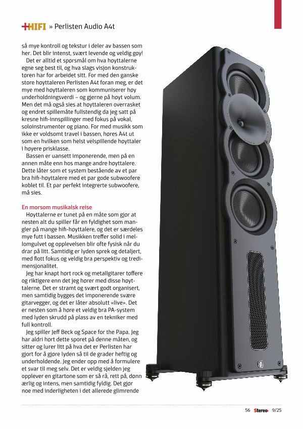 Det er alltid et spørsmål om hva høyttalerne egne seg best til, og hva slags visjon konstruktøren har for arbeidet sitt. For med den ganske store høyttaleren Perlisten A4t foran meg, er det mye med høyttaleren som kommuniserer høy underholdningsverdi – og gjerne på høyt volum. Men det må også sies at høyttaleren overrasket og endret spillemåte fullstendig da jeg satt på kresne hifi-innspillinger med fokus på vokal, soloinstrumenter og piano. For med musikk som ikke er voldsomt travel i bassen, høres A4t ut som en hvilken som helst velspillende høyttaler i høyere prisklasse.