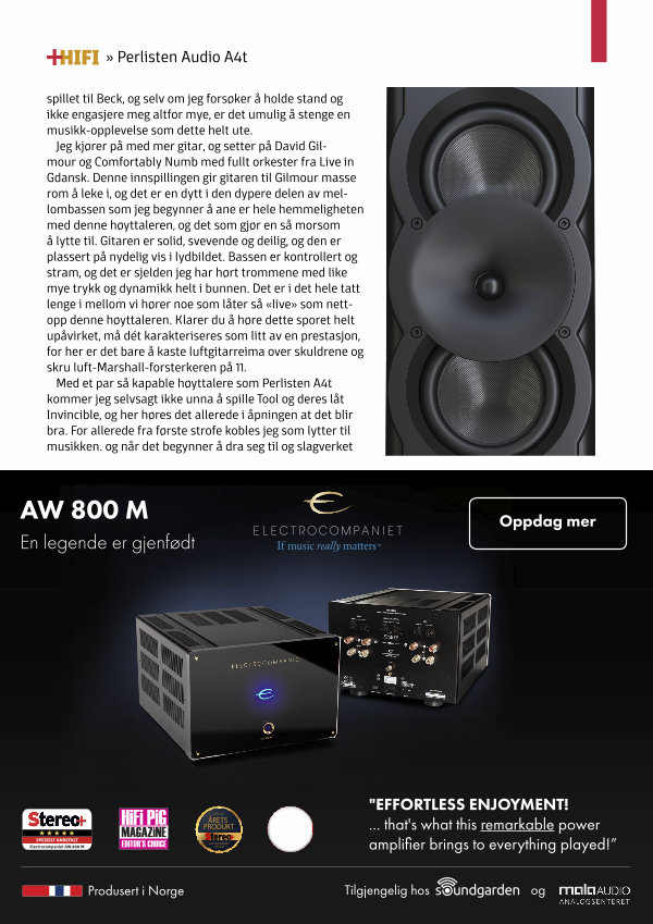 Med et par så kapable høyttalere som Perlisten A4t kommer jeg selvsagt ikke unna å spille Tool og deres låt Invincible, og her høres det allerede i åpningen at det blir bra. For allerede fra første strofe kobles jeg som lytter til musikken. og når det begynner å dra seg til og slagverket