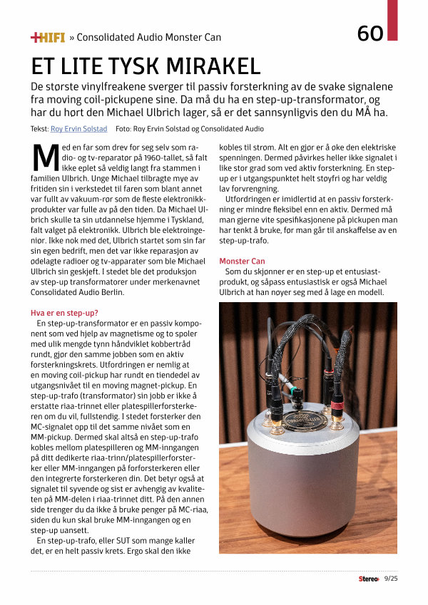 De største vinylfreakene sverger til passiv forsterkning av de svake signalene fra moving coil-pickupene sine. Da må du ha en step-up-transformator, og har du hørt den Michael Ulbrich lager, så er det sannsynligvis den du MÅ ha.