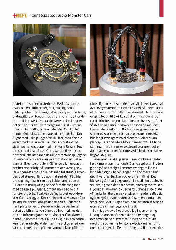 plutselig høres ut som den har fått i seg et arsenal av ulovlige steroider. Dette er vinyl på speed, uten at det virker påtatt eller overdrevent. Den får bare originallyden til å virke sedat og tilbakelent. Dynamikkforbedringen skjer i hele frekvensområdet, så det er ikke bare nedover i bassen og mellombassen det klinker til. Både store og små variasjoner og store og små start og stopp i musikken blir langt tydeligere med Monster Can mellom platespilleren og Mola Mola-trinnet mitt. Et trinn som må innrømmes er ekstremt bra, men det er åpenbart enda mer å hente ved å bruke en skikkelig god step-up.