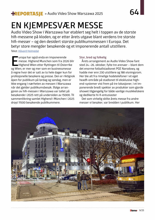 Stor, bred og folkelig Årets arrangement av Audio Video Show fant sted 24.– 26. oktober, fylte tre arenaer – blant dem det enorme fotballstadionet PGE Narodowy, og hadde mer enn 230 utstillere og 188 visningsrom. Her ble alt fra rimelige hodetelefoner i et eget headfi-område på stadionet til eksklusive highend-systemer vist frem på tre lokasjoner, i et imponerende bredt spekter av produkter som gjorde showet tilgjengelig for både vanlige musikkelskere og dedikerte hi-fi-entusiaster