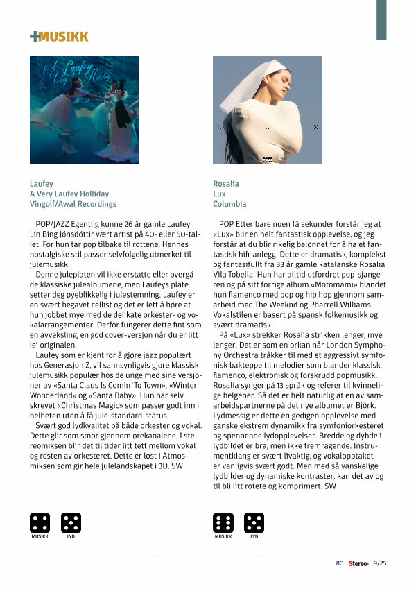 Denne juleplaten vil ikke erstatte eller overgå de klassiske julealbumene, men Laufeys plate setter deg øyeblikkelig i julestemning. Laufey er en svært begavet cellist og det er lett å høre at hun jobbet mye med de delikate orkester- og vokalarrangementer. Derfor fungerer dette fint som en avveksling, en god cover-versjon når du er litt lei originalen.