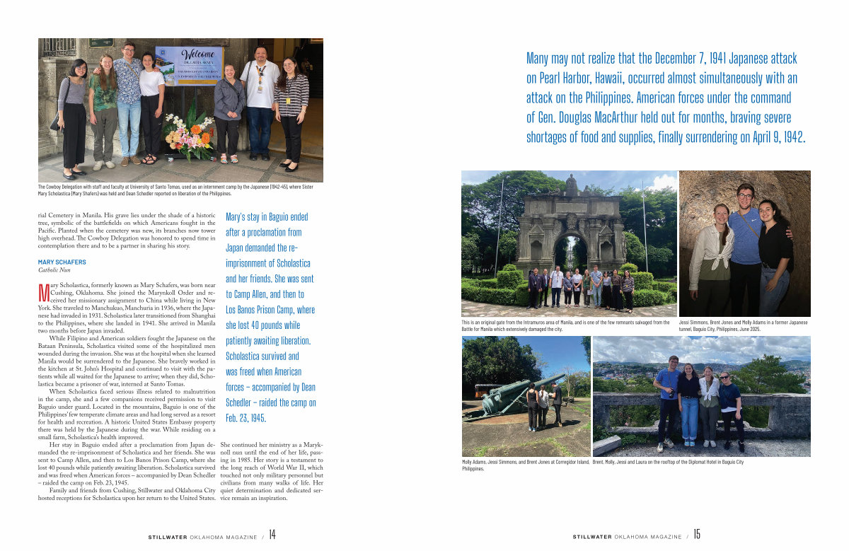 rial Cemetery in Manila. His grave lies under the shade of a historic tree, symbolic of the battlefields on which Americans fought in the Pacific. Planted when the cemetery was new, its branches now tower high overhead. The Cowboy Delegation was honored to spend time in contemplation there and to be a partner in sharing his story.