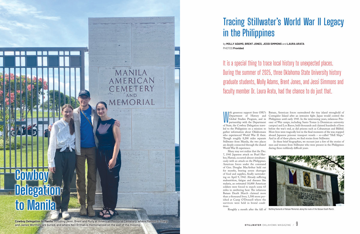 With generous support from OSU’ s Department of History and Global Studies Program, and in partnership with the Department of State, the Cowboy Delegation traveled to the Philippines on a mission: to gather information about Oklahomans who experienced World War II there. Though roughly 8,200 miles separate Stillwater from Manila, the two places are deeply connected through the shared World War II experience.