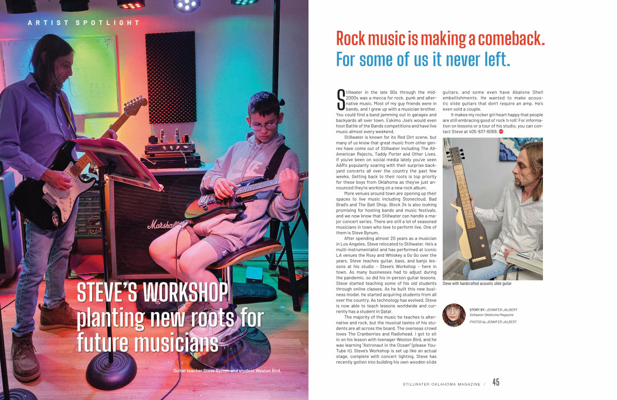 After spending almost 20 years as a musician in Los Angeles, Steve relocated to Stillwater. He ' s a multi-instrumentalist and has performed at iconic LA venues the Roxy and Whiskey a Go Go over the years. Steve teaches guitar, bass, and banjo lessons at his studio – Steve ' s Workshop – here in town. As many businesses had to adjust during the pandemic, so did his in-person guitar lessons. Steve started teaching some of his old students through online classes. As he built this new business model, he started acquiring students from all over the country. As technology has evolved, Steve is now able to teach lessons worldwide and currently has a student in Qatar.