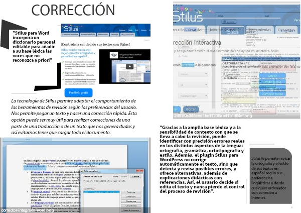 “Gracias a la amplia base léxica y a la sensibilidad de contexto con que se lleva a cabo la revisión, puede identificar con precisión errores reales en los distintos aspectos de la lengua: ortografía, gramática, ortotipografía y estilo. Además, el plugin Stilus para WordPress no corrige automáticamente el texto, sino que detecta y revisa posibles errores, y ofrece alternativas, además de explicaciones didácticas con referencias. Así, el usuario decide si edita el texto y nunca pierde el control del proceso de revisión”.