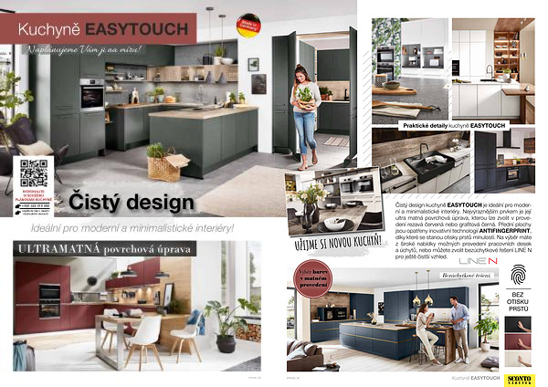 Čistý design kuchyně EASYTOUCH je ideální pro moderní a minimalistické interiéry . Nejvýraznějším prvkem je její ultra matná povrchová úprava , kterou lze zvolit v provedení rezavá červená nebo grafitová černá . Přední plochy jsou opatřeny inovativní technologií ANTIFINGERPRINT , díky které se stanou otisky prstů minulostí . Na výběr máte z široké nabídky možných provedení pracovních desek a úchytů , nebo můžete zvolit bezúchytkové řešení LINE N pro ještě čistší vzhled .