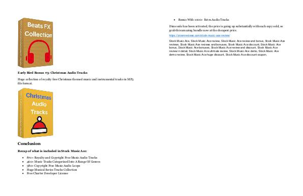 Early Bird Bonus #5: Christmas Audio Tracks Huge collection of royalty free Christmas themed music and instrumental tracks in MP3 file format. Conclusion Recap of what is included in Stock Music Ace: • • • • • 870+ Royalty and Copyright Free Music Audio Tracks 460+ Music Tracks Categorized Into A Range Of Genres 380+ Copyright Free Music Audio Loops Huge Musical Series Tracks Collection Free Charter Developer License