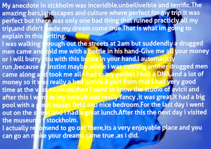 I was walking through out the streets at 2am but suddendly a drugged men came and told me with a bottle in his hand-Give me all your money or i will burry you with this bottle in your hand.I automaticly run ,because of instint maybe ,while i was running anoher drugged men came along and took me all i had in my pocket.I had a DNA,and a lot of money so it was really a bad notice.A part from that i had very good time at the vass museum,then i went to know the studio of avicii and after this i went to my hotel,it was really fancy ,it was great.It had a big pool with a great soccer field and nice bedroom.For the last day i went out on the street and i had a great lunch.After this the next day i visited the museums f stockholm.