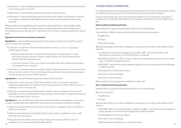 Gold standard monitoring elements . Standard Reef Trust gully and streambank toolbox monitoring techniques . High resolution LiDAR to measure net loss sediment and remote sensing tools
