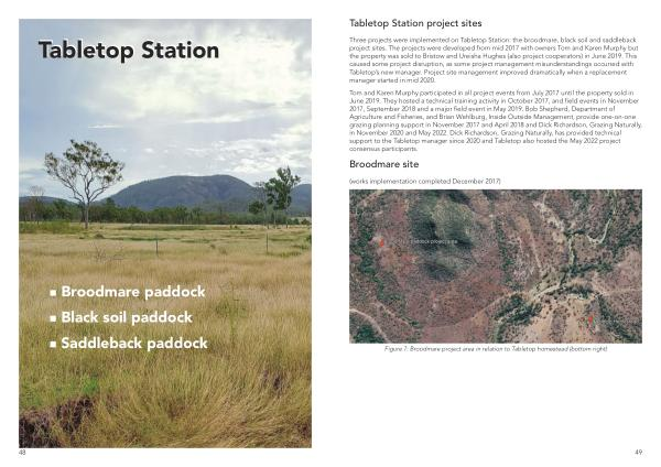 Three projects were implemented on Tabletop Station : the broodmare , black soil and saddleback project sites . The projects were developed from mid 2017 with owners Tom and Karen Murphy but the property was sold to Bristow and Ureisha Hughes ( also project cooperators ) in June 2019 . This caused some project disruption , as some project management misunderstandings occurred with Tabletop ’ s new manager . Project site management improved dramatically when a replacement manager started in mid 2020 .
