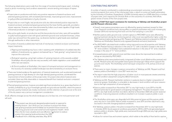 A number of reports contributed to understandings around project outcomes , including DAF monitoring reports from some of the initial project sites , a report on some soil health parameters by the University of Southern Queensland , a Griffith University report on LiDAR data from a number of project sites , and a report by Dr Christian Roth on the outcomes of a scientist , field officer , grazier review of some of the main project sites .