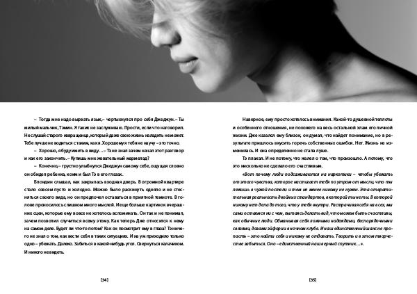 « Вот почему люди подсаживаются на наркотики – чтобы убежать от этого чувства, которое настигает тебя по утрам от мысли, что ты лежишь в чужой постели и тем не менее никому не нужен. Эта отвратительная реальность двойных стандартов, в которой ты не ты. В которой никому нет дела до того, что у тебя внутри. Растрачивая себя на всех, мы сами остаемся ни с чем, пытаясь делать вид, что можем быть счастливы, как обычные люди. Обманывая себя ложными надеждами, беспорядочными связями, дозами эйфории в ночном клубе. И наш единственный шанс не пропасть – это найти себя и никому не отдавать. Творить и в этом творчестве забыться. Оно – единственный наш верный спутник …».