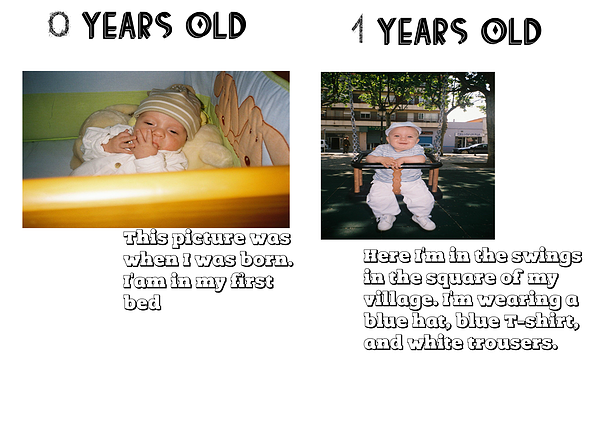 Here I'm in the swings in the square of my village. I'm wearing a blue hat, blue T-shirt, and white trousers.