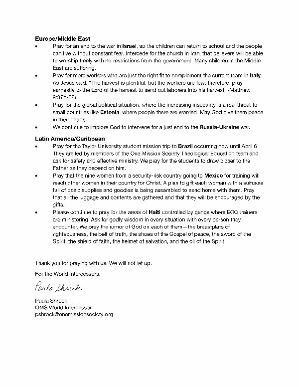 Paula Shrock OMS World Intercessor pshrock @ onemissionsociety. org