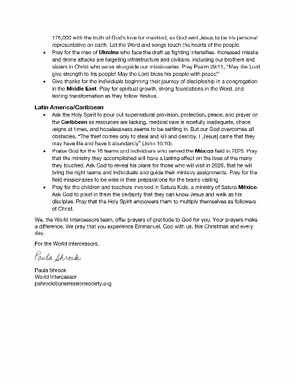 Paula Shrock World Intercessor pshrock @ onemissionsociety. org