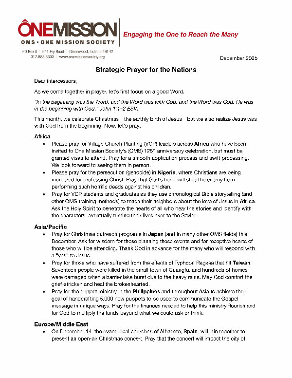 • Pray for Christmas outreach programs in Japan( and in many other OMS fields) this December. Ask for wisdom for those planning these events and for receptive hearts of those who will be attending. Thank God in advance for the many who will respond with a“ yes” to Jesus.
