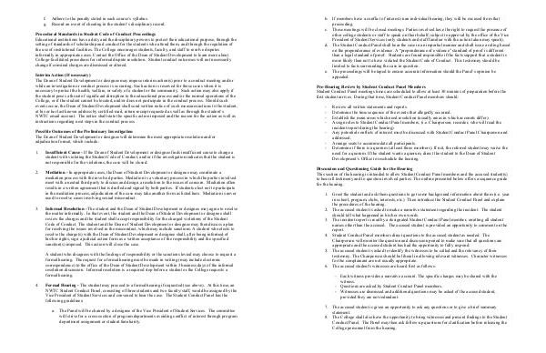 Procedural Standards in Student Code of Conduct Proceedings Educational institutions have a duty and the disciplinary powers to protect their educational purpose, through the setting of standards of scholarship and conduct for the students who attend them, and through the regulation of the use of institutional facilities. The College encourages students, faculty, and staff to resolve disputes informally in appropriate cases. Contact the Office of the Dean of Student Development to learn more about College-facilitated procedures for informal dispute resolution. Student conduct outcomes will not necessarily change if criminal charges are dismissed or altered.