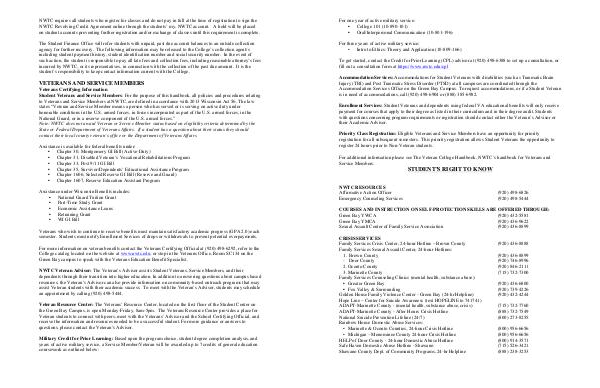 NWTC Veteran Advisor: The Veteran’ s Advisor assists Student Veterans, Service Members, and their dependents through their transition into higher education. In addition to answering questions about campus based resources, the Veteran’ s Advisor can also provide information on community-based outreach programs that may assist Veteran students with their academic success. To meet with the Veteran’ s Advisor, students may schedule an appointment by calling( 920) 498-5444.