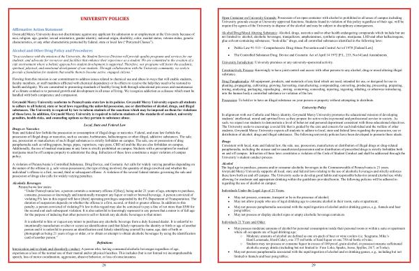 Gwynedd Mercy University conforms to Pennsylvania state law in its policies . Gwynedd Mercy University expects all students to adhere to all federal , state or local laws regarding the unlawful possession , use or distribution of alcohol , drugs , and illegal substances . The University is required by law to inform students of the sanctions which may be imposed on them for violations of those laws . In addition , Gwynedd Mercy University is required to inform students of the standards of conduct , university penalties , health risks , and counseling options as they pertain to substance abuse .